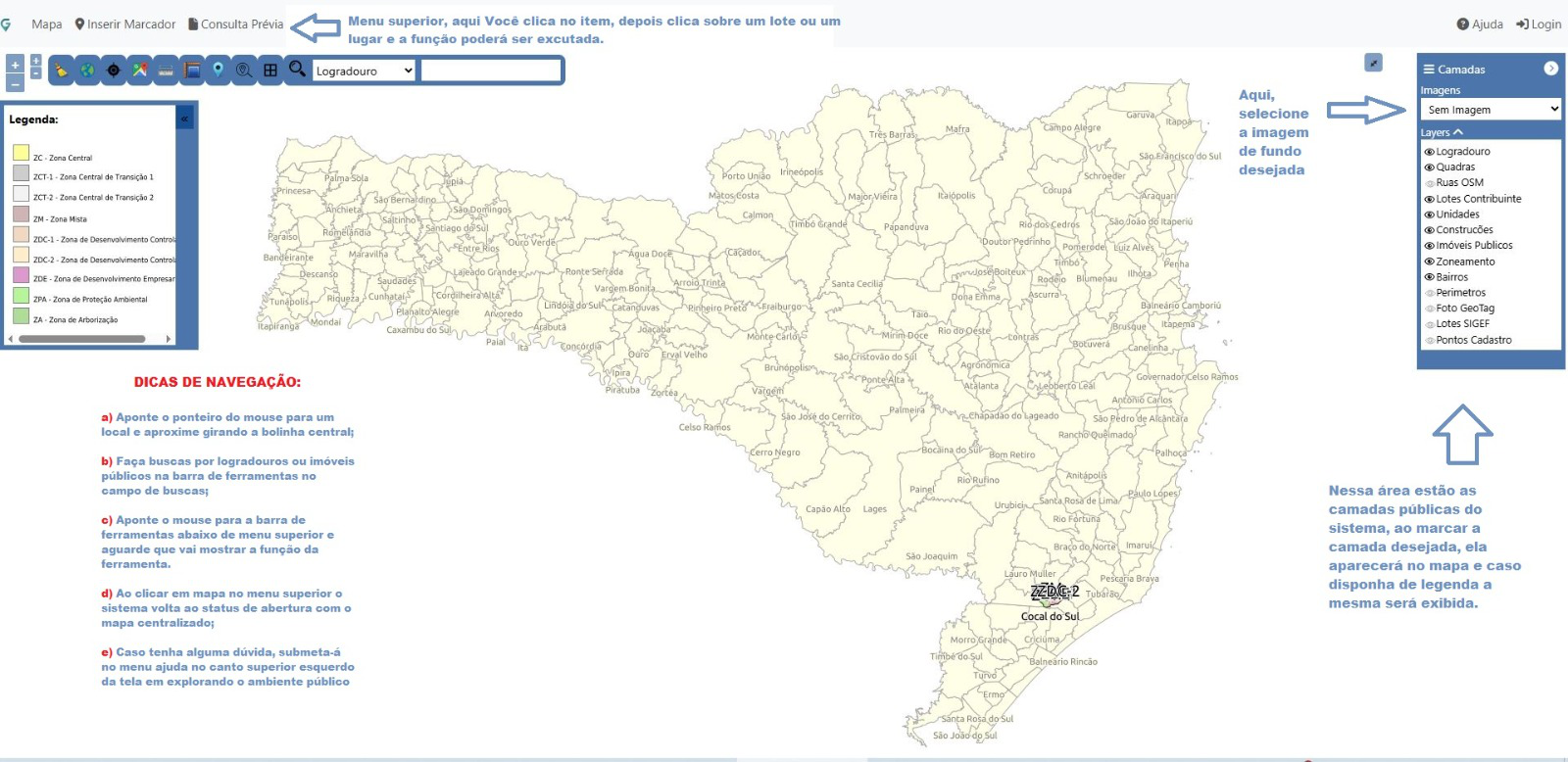 Esse é o ambiente onde você pode verificar as principais perguntas sobre o acesso público do sistema de geoprocessamento e conhecer detalhadamente as suas funcionalidades.